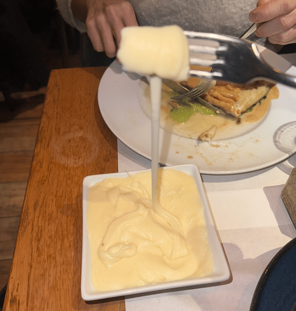 En ce moment, je ne pense qu’à ça : l’aligot. J’ai fait un sujet sur celui du restaurant Les Fous de l’Île, top, parfaitement filant, avec ce bon goût de fromage frais. Celui de La Petite Périgourdine est plus léger, plus digeste aussi, comme une mousseline agrémentée de fromage.